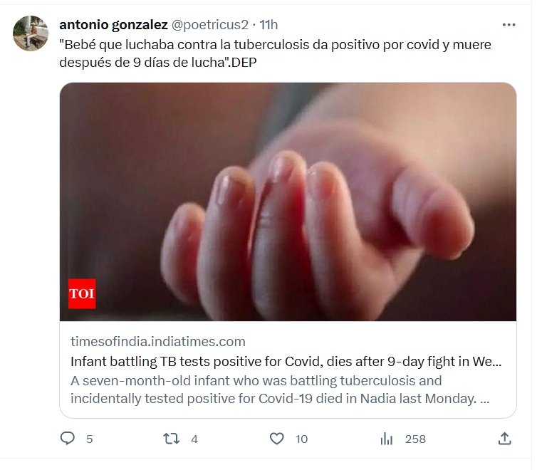 LESA HUMANIDAD «Bebé que luchaba contra la tuberculosis da positivo por covid y muere después de 9 días de lucha».DEP Posted on agosto 4, 2023 por coronado https://timesofindia.indiatimes.com/city/kolkata/infant-battling-tb-tests-positive-for-covid-dies-after-9-day-fight/articleshow/102406419.cms