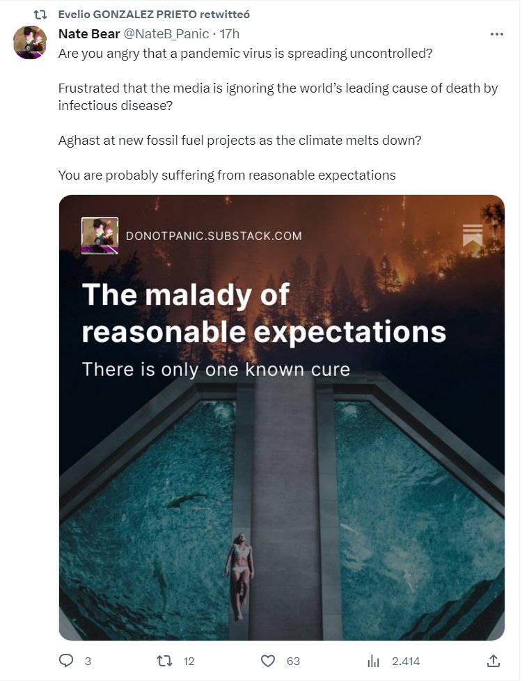 EN INGLÉS ¿Estás enojado porque un virus pandémico se está propagando sin control? ¿Frustrado porque los medios están ignorando la principal causa de muerte en el mundo por enfermedades infecciosas? ¿Horrorizado por los nuevos proyectos de combustibles fósiles a medida que el clima se derrite? Probablemente estés sufriendo de expectativas razonables