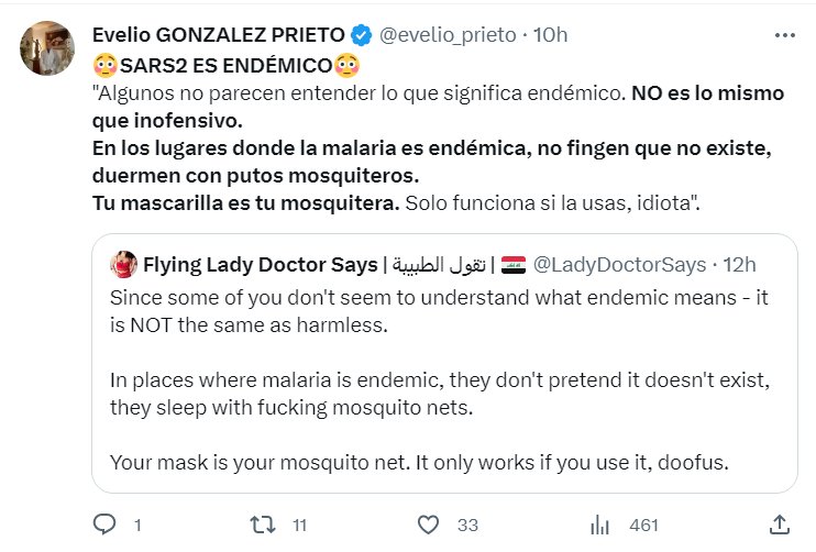 FUERTE Y CLARO! 😳SARS2 ES ENDÉMICO😳 «Algunos no parecen entender lo que significa endémico. NO es lo mismo que inofensivo. En los lugares donde la malaria es endémica, no fingen que no existe, duermen con putos mosquiteros. Tu mascarilla es tu mosquitera. Solo funciona si la usas, idiota».