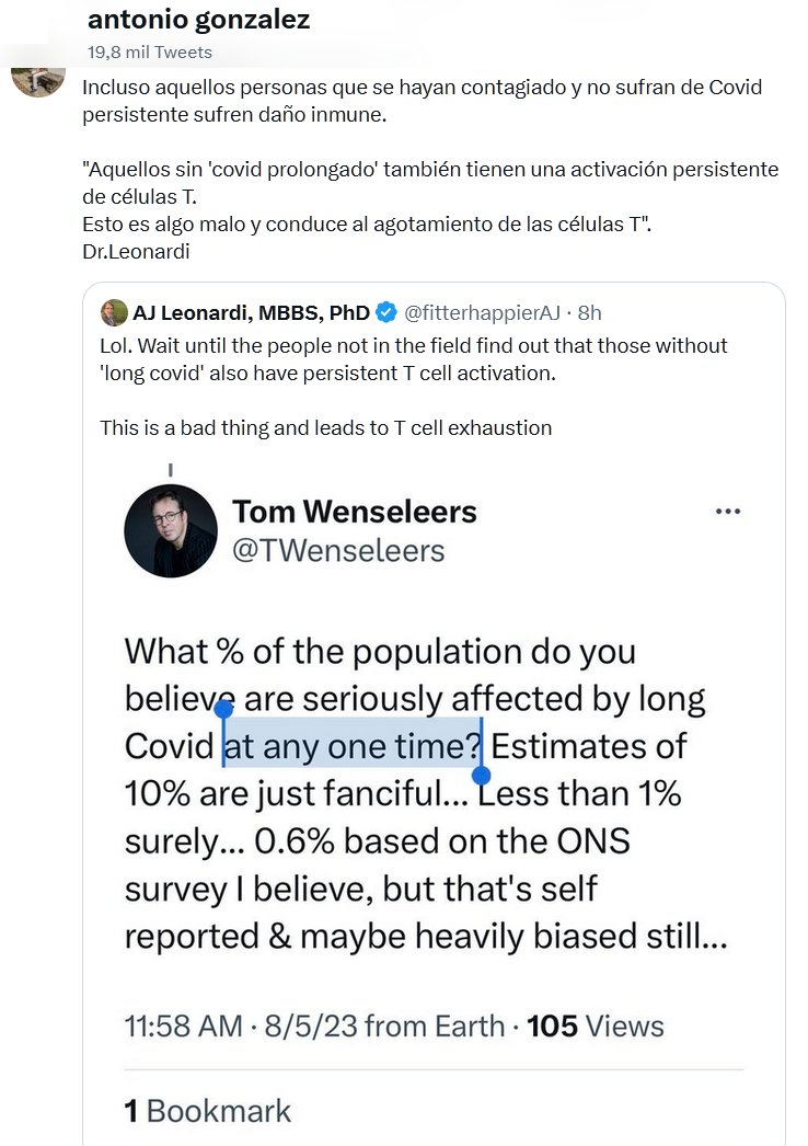 Incluso aquellos personas que se hayan contagiado y no sufran de Covid persistente sufren daño inmune. «Aquellos sin ‘covid prolongado’ también tienen una activación persistente de células T. Esto es algo malo y conduce al agotamiento de las células T». Dr.Leonardi AJ Leonardi, MBBS, PhD