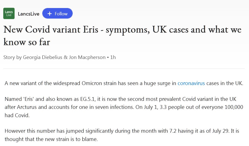 EN INGLÉS Una nueva variante de la cepa Omicron generalizada ha visto un gran aumento en los casos de coronavirus en el Reino Unido. Llamada ‘Eris’ y también conocida como EG.5.1, ahora es la segunda variante de Covid más frecuente en el Reino Unido después de Arcturus y representa una de cada siete infecciones. El 1 de julio, 3,3 personas de cada 100.000 tenían Covid.