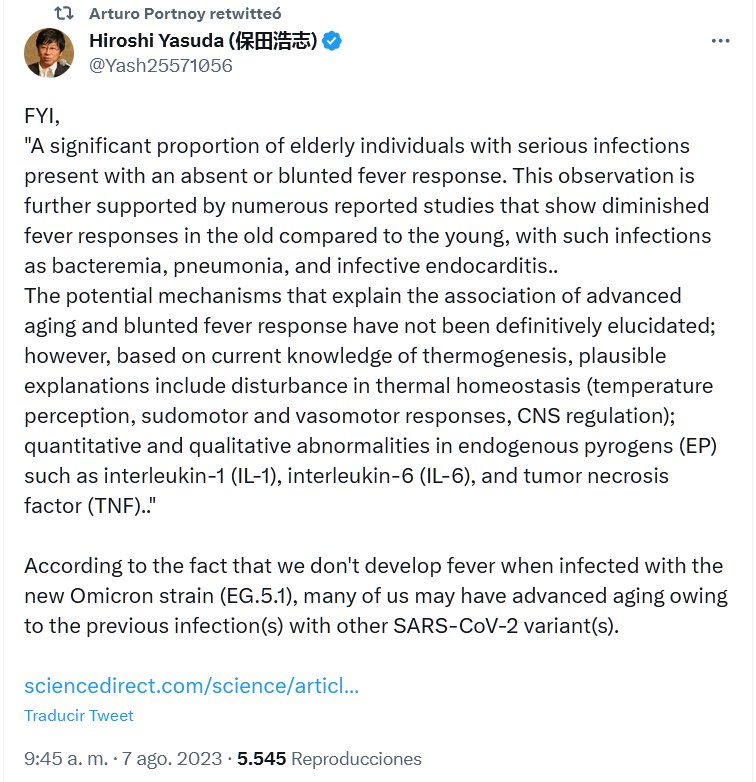 EN INGLÉS «Una proporción significativa de personas de edad avanzada con infecciones graves presentan una respuesta febril ausente o embotada. Esta observación está respaldada por numerosos estudios informados que muestran una disminución de la respuesta febril en los ancianos en comparación con los jóvenes, con infecciones tales como bacteriemia, neumonía y endocarditis infecciosa…»
