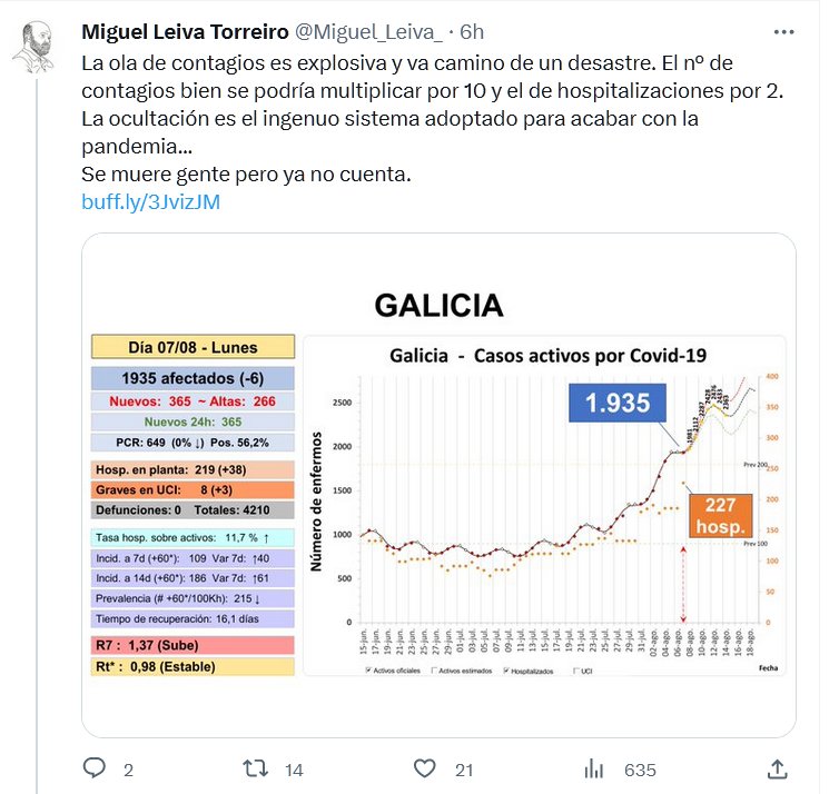 La ola de contagios es explosiva y va camino de un desastre. El nº de contagios bien se podría multiplicar por 10 y el de hospitalizaciones por 2. La ocultación es el ingenuo sistema adoptado para acabar con la pandemia… Se muere gente pero ya no cuenta.