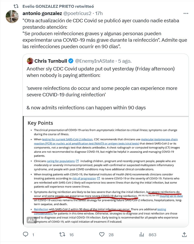 «Otra actualización de CDC Covid se publicó ayer cuando nadie estaba prestando atención: «Se producen reinfecciones graves y algunas personas pueden experimentar una COVID-19 más grave durante la reinfección». Admite que las reinfecciones pueden ocurrir en 90 días».