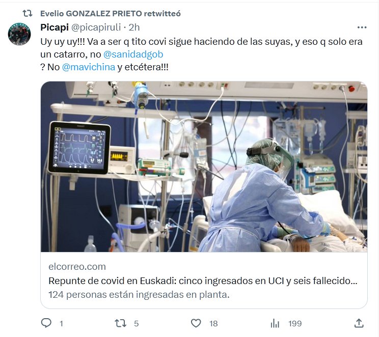 SARCASMO Uy uy uy!!! Va a ser q tito covi sigue haciendo de las suyas, y eso q solo era un catarro, no @sanidadgob ? No @mavichina y etcétera!!! > Repunte de covid en Euskadi: cinco ingresados en UCI y seis fallecidos en una semana 124 personas están ingresadas en planta. La media de diaria es de 15, tres veces más que hace un mes