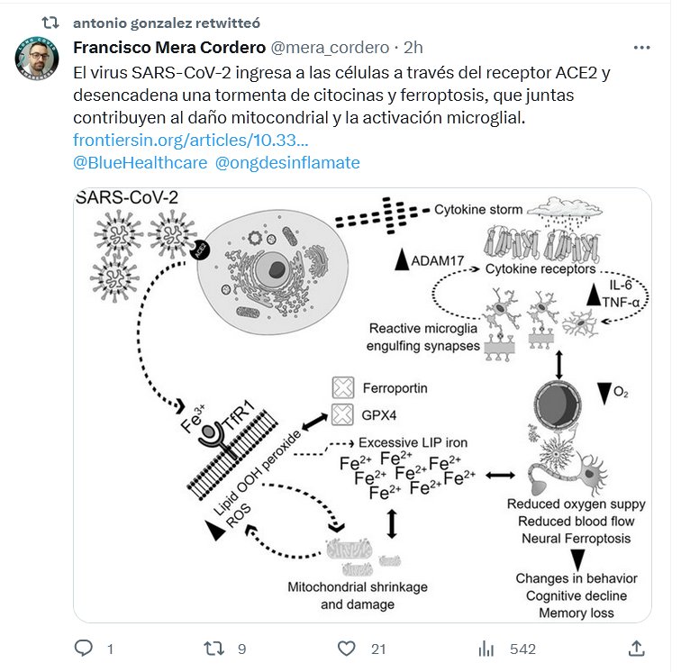 El virus SARS-CoV-2 ingresa a las células a través del receptor ACE2 y desencadena una tormenta de citocinas y ferroptosis, que juntas contribuyen al daño mitocondrial y la activación microglial.