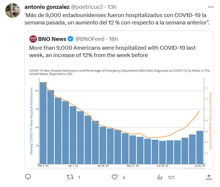 FIN DE PANDEMIA? ‘Más de 9,000 estadounidenses fueron hospitalizados con COV1D-19 la semana pasada, un aumento del 12 % con respecto a la semana anterior». Posted on agosto 9, 2023 por coronado