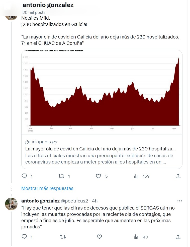 No, si es Mild. ¡230 hospitalizados en Galicia! «La mayor ola de covid en Galicia del año deja más de 230 hospitalizados, 71 en el CHUAC de A Coruña» Posted on agosto 9, 2023 por coronado .