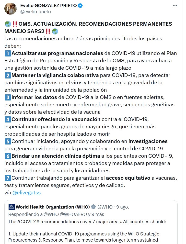 🌏‼️OMS. ACTUALIZACIÓN. RECOMENDACIONES PERMANENTES MANEJO SARS2‼️🌏 Las recomendaciones cubren 7 áreas principales Posted on agosto 10, 2023 por coronado -