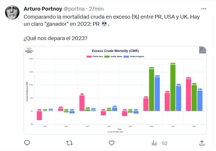 DEFENSA CONTRA COVID EN «1º MUNDO» VS. RESTO DEL MUNDO (SAQUEADORES VS. SAQUEADOS) Comparando la mortalidad cruda en exceso (%) entre PR (PUERTO RICO), USA y UK. Hay un claro «ganador» en 2022: PR 💀. ¿Qué nos depara el 2023?