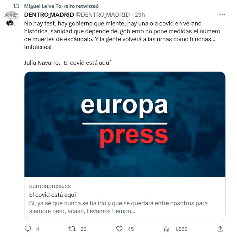 DENTRO_MADRID @DENTRO_MADRID · No hay test, hay gobierno que miente, hay una ola covid en verano histórica, sanidad que depende del gobierno no pone medidas,el número de muertes de escándalo. Y la gente volverá a las urnas como hinchas… Imbéciles! Julia Navarro.- El covid está aquí