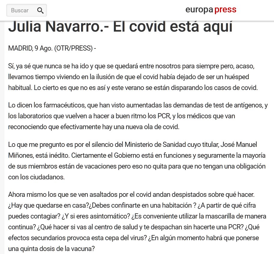 Julia Navarro.- El covid está aquí Sí, ya sé que nunca se ha ido y que se quedará entre nosotros para siempre pero, acaso, llevamos tiempo viviendo en la ilusión de que el covid había dejado de ser un huésped habitual. Lo cierto es que no es así y este verano se están disparando los casos de covid.