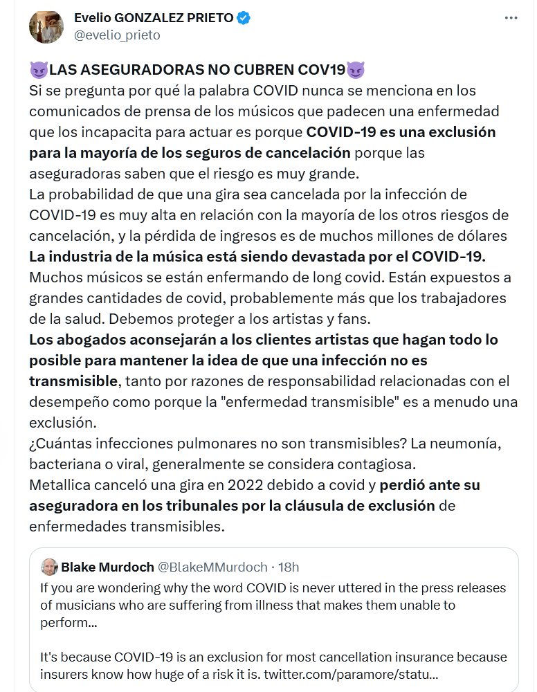 😈LAS ASEGURADORAS NO CUBREN COV19😈 Si se pregunta por qué la palabra COVID nunca se menciona en los comunicados de prensa de los músicos que padecen una enfermedad que los incapacita para actuar es porque COVID-19 es una exclusión para la mayoría de los seguros de cancelación