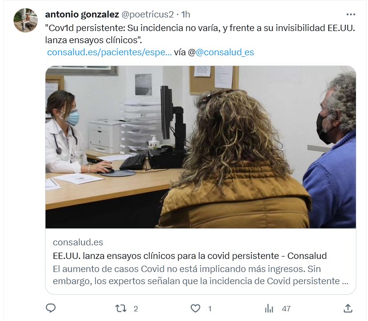 «Covid persistente: Su incidencia no varía, y frente a su invisibilidad EE.UU. lanza ensayos clínicos». Posted on agosto 11, 2023 por coronado https://www.consalud.es/pacientes/especial-coronavirus/covid-persistente-invisibilidad-eeuu-lanza-ensayos-clinicos_133326_102.html
