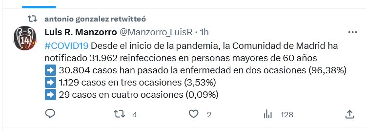 DATOS PARA ANALIZAR #COVID19 Desde el inicio de la pandemia, la Comunidad de Madrid ha notificado 31.962 reinfecciones en personas mayores de 60 años ➡️ 30.804 casos han pasado la enfermedad en dos ocasiones (96,38%) ➡️ 1.129 casos en tres ocasiones (3,53%) ➡️ 29 casos en cuatro ocasiones (0,09%)