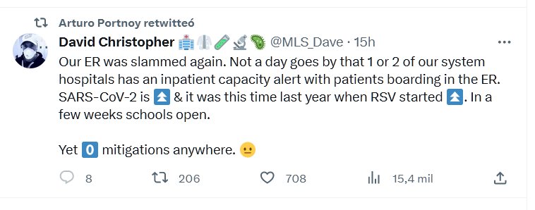 EN INGLÉS Nuestra sala de emergencias fue cerrada de nuevo. No pasa un día sin que 1 o 2 de los hospitales de nuestro sistema tengan una alerta de capacidad de hospitalización con pacientes ingresando en la sala de emergencias. SARS-CoV-2 es ⏫ y fue en esta época el año pasado cuando comenzó RSV ⏫. En unas semanas abren las escuelas. Sin embargo, 0️⃣ mitigaciones en cualquier lugar. 😐