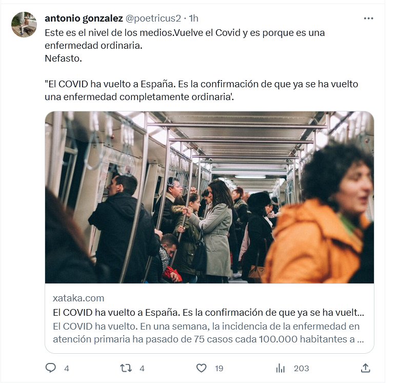 LA BESTIA MINIMIZADORA MORTAL Este es el nivel de los medios. Vuelve el Covid y es porque es una enfermedad ordinaria. Nefasto. «El COVID ha vuelto a España. Es la confirmación de que ya se ha vuelto una enfermedad completamente ordinaria’.