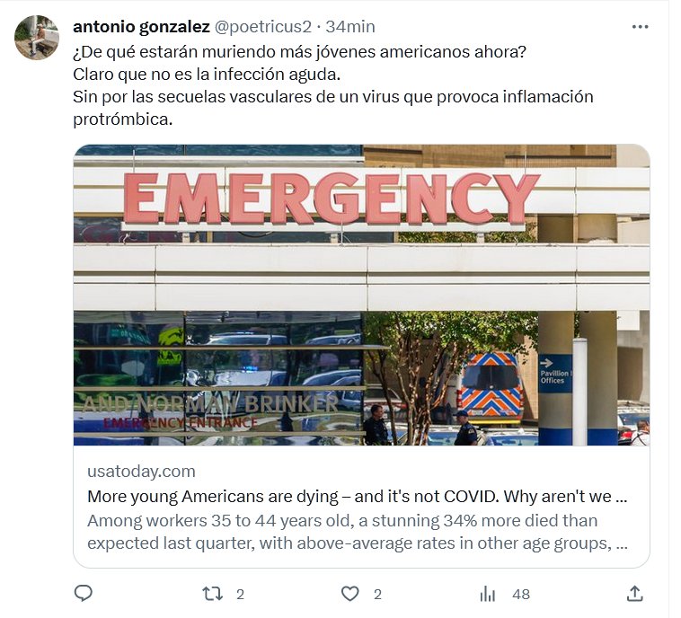 NODIGASQUEESCOVID HACE ESTRAGOS ¿De qué estarán muriendo más jóvenes americanos ahora? Claro que no es la infección aguda. Sin por las secuelas vasculares de un virus que provoca inflamación protrómbica.
