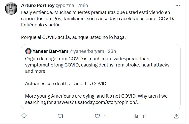 Lea y entienda. Muchas muertes prematuras que usted está viendo en conocidos, amigos, familiares, son causadas o aceleradas por el COVID. Entiéndalo y actúe. Porque el COVID actúa, aunque usted no lo haga.