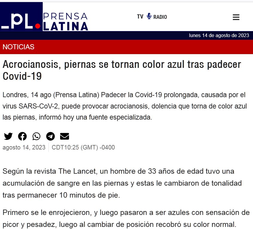 Acrocianosis, piernas se tornan color azul tras padecer Covid-19 Posted on agosto 14, 2023 por coronado https://www.prensa-latina.cu/2023/08/14/acrocianosis-piernas-se-tornan-color-azul-tras-padecer-covid-19