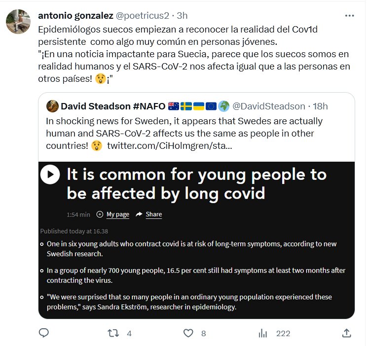 COVIDIOTAS Epidemiólogos suecos empiezan a reconocer la realidad del Covid persistente como algo muy común en personas jóvenes. «¡En una noticia impactante para Suecia, parece que los suecos somos en realidad humanos y el SARS-CoV-2 nos afecta igual que a las personas en otros países! 😲¡»