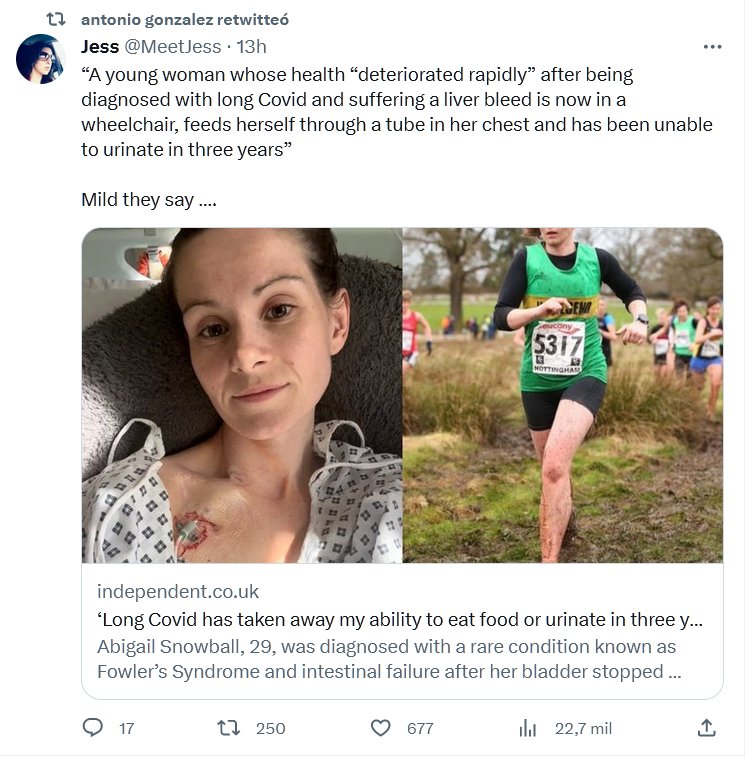 EN INGLÉS “Una mujer joven cuya salud “se deterioró rápidamente” tras ser diagnosticada con Covid de larga duración y sufrir una hemorragia hepática ahora está en silla de ruedas, se alimenta a través de un tubo en el pecho y no ha podido orinar en tres años” Suave dicen…. (Mild they say ….)
