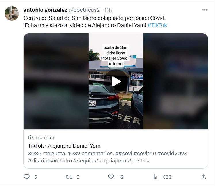 FIN DE PANDEMIA? Centro de Salud de San Isidro colapsado por casos Covid. ¡Echa un vistazo al vídeo de Alejandro Daniel Yam! #TikTok Posted on agosto 14, 2023 por coronado https://www.tiktok.com/@alejandroyamagata/video/7265713733249305862?_r=1&_t=8eouvMUVXc0