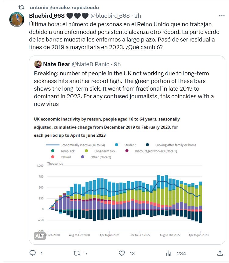 Última hora: el número de personas en el Reino Unido que no trabajan debido a una enfermedad persistente alcanza otro récord. La parte verde de las barras muestra los enfermos a largo plazo. Pasó de ser residual a fines de 2019 a mayoritaria en 2023. ¿Qué cambió?