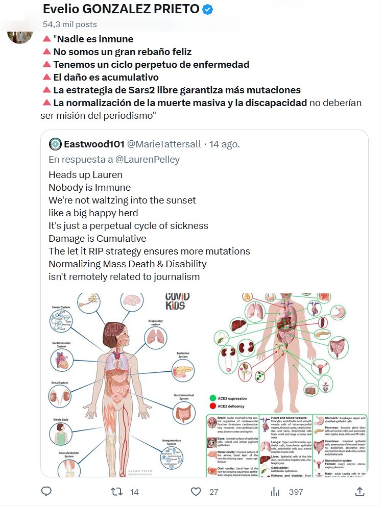 🔺»Nadie es inmune 🔺No somos un gran rebaño feliz 🔺Tenemos un ciclo perpetuo de enfermedad 🔺El daño es acumulativo 🔺La estrategia de Sars2 libre garantiza más mutaciones 🔺La normalización de la muerte masiva y la discapacidad no deberían ser misión del periodismo»