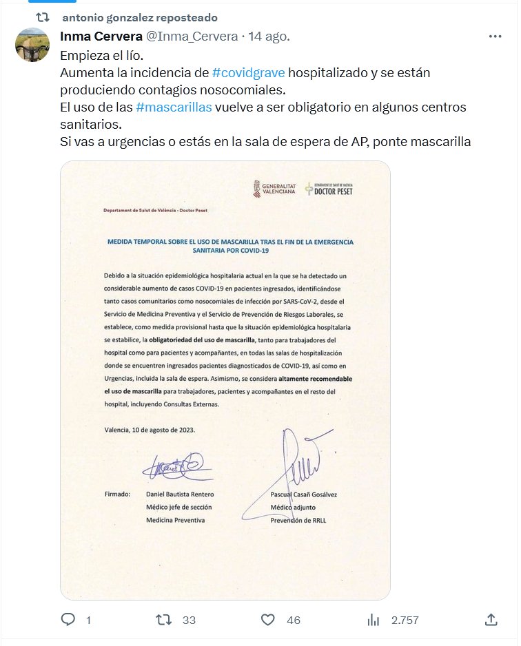 Empieza el lío. Aumenta la incidencia de #covidgrave hospitalizado y se están produciendo contagios nosocomiales. El uso de las #mascarillas vuelve a ser obligatorio en algunos centros sanitarios. Si vas a urgencias o estás en la sala de espera de AP, ponte mascarilla