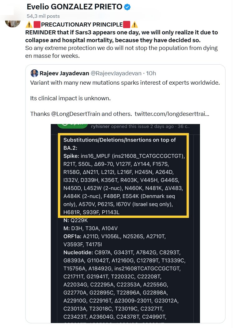 EN INGLÉS ⚠️🟥PRINCIPIO DE PRECAUCIÓN🟥⚠️ RECORDATORIO que si el Sars3 aparece un día, solo nos daremos cuenta por colapso y mortalidad hospitalaria, porque así lo han decidido. Así que cualquier protección extrema que hagamos no evitará que la población muera en masa durante semanas.