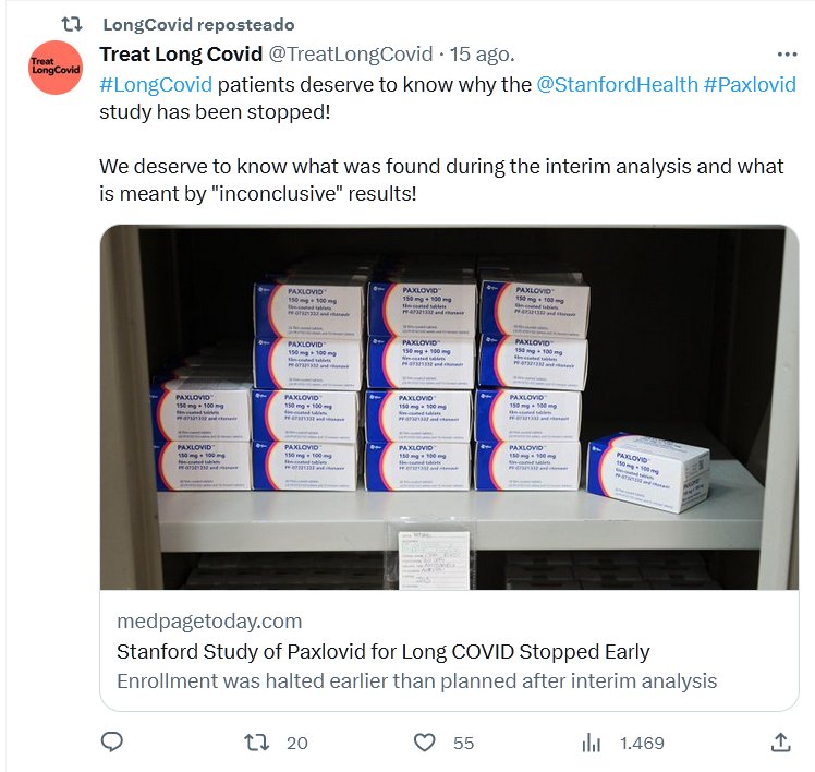 EN INGLÉS Los pacientes de #LongCovid merecen saber por qué @StanfordHealth ha detenido el estudio de #Paxlovid! ¡Merecemos saber qué se encontró durante el análisis intermedio y qué se entiende por resultados «no concluyentes»!