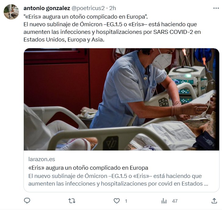 ««Eris» augura un otoño complicado en Europa». El nuevo sublinaje de Ómicron –EG.1.5 o «Eris»– está haciendo que aumenten las infecciones y hospitalizaciones por SARS COVID-2 en Estados Unidos, Europa y Asia.