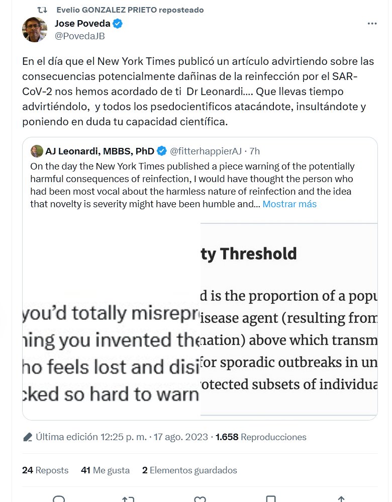 En el día que el New York Times publicó un artículo advirtiendo sobre las consecuencias potencialmente dañinas de la reinfección por el SAR-CoV-2 nos hemos acordado de ti Dr Leonardi…. Que llevas tiempo advirtiéndolo, y todos los psedocientificos atacándote, insultándote y poniendo en duda tu capacidad científica.
