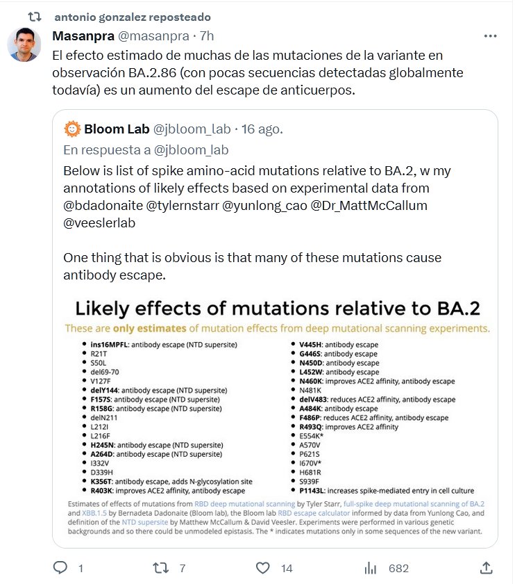 El efecto estimado de muchas de las mutaciones de la variante en observación BA.2.86 (con pocas secuencias detectadas globalmente todavía) es un aumento del escape de anticuerpos. Posted on agosto 18, 2023 por coronado