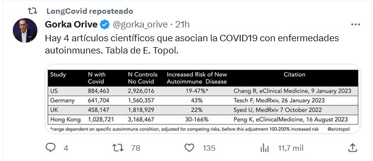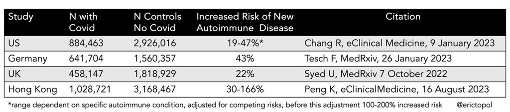 Hay 4 artículos científicos que asocian la COVID19 con enfermedades autoinmunes. Tabla de E. Topol. Posted on agosto 18, 2023 por coronado