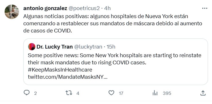 Algunas noticias positivas: algunos hospitales de Nueva York están comenzando a restablecer sus mandatos de máscara debido al aumento de casos de COVID. Posted on agosto 19, 2023 por coronado