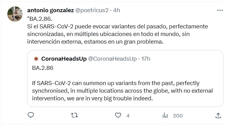 BA.2.86. Si el SARS-CoV-2 puede evocar variantes del pasado, perfectamente sincronizadas, en múltiples ubicaciones en todo el mundo, sin intervención externa, estamos en un gran problema. Posted on agosto 19, 2023 por coronado