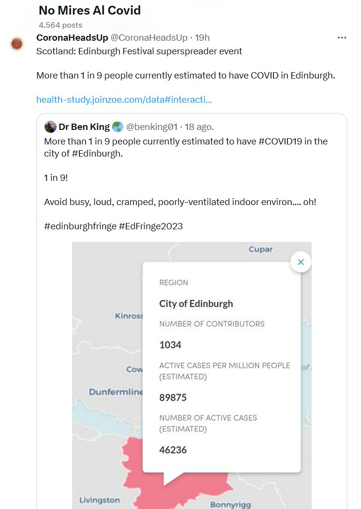 Escocia: evento superpropagador del Festival de Edimburgo Actualmente se estima que más de 1 de cada 9 personas tienen COVID en Edimburgo. Posted on agosto 19, 2023 por coronado