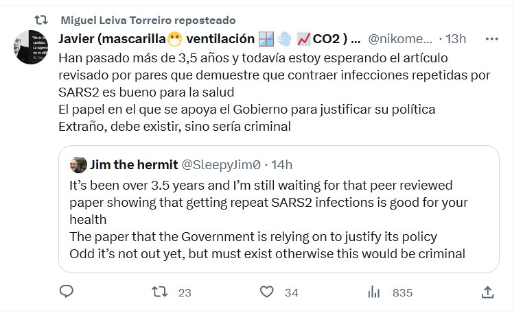 Han pasado más de tres años y medio y todavía estoy esperando ese documento revisado por expertos que demuestre que contraer infecciones repetidas de SRAS2 es bueno para la salud. El documento en el que el Gobierno se basa para justificar su política. Es extraño que no haya salido todavía, pero debe existir, de lo contrario esto sería criminal.