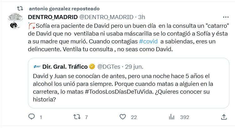 TESTIMONIOS 🏹Sofía era paciente de David pero un buen día en la consulta un «catarro» de David que no ventilaba ni usaba máscarilla se lo contagió a Sofía y ésta a su madre que murió. Cuando contagias #covid a sabiendas, eres un delincuente. Ventila tu consulta , no seas como David.