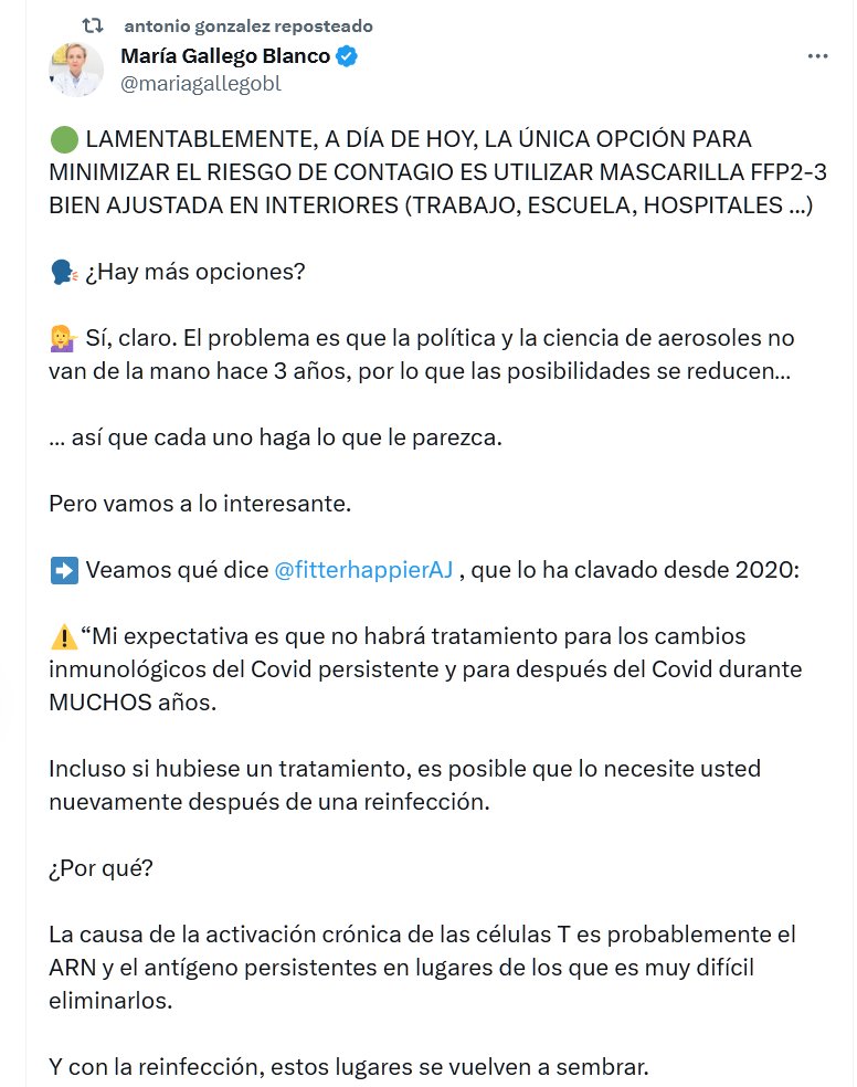 🟢 LAMENTABLEMENTE, A DÍA DE HOY, LA ÚNICA OPCIÓN PARA MINIMIZAR EL RIESGO DE CONTAGIO ES UTILIZAR MASCARILLA FFP2-3 BIEN AJUSTADA EN INTERIORES (TRABAJO, ESCUELA, HOSPITALES …) 🗣️ ¿Hay más opciones? 💁♀️ Sí, claro. El problema es que la política y la ciencia de aerosoles no van de la mano hace 3 años, por lo que las posibilidades se reducen…