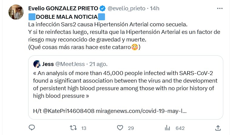 🟦DOBLE MALA NOTICIA🟦 La infección Sars2 causa Hipertensión Arterial como secuela. Y si te reinfectas luego, resulta que la Hipertensión Arterial es un factor de riesgo muy reconocido de gravedad y muerte. (Qué cosas más raras hace este catarro😳)