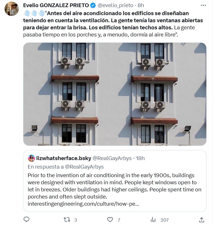 ESTA PANDEMIA ES DIFERENTE PORQUE TAMBIÉN EL MUNDO ES DIFERENTE 💨💨💨»Antes del aire acondicionado los edificios se diseñaban teniendo en cuenta la ventilación. La gente tenía las ventanas abiertas para dejar entrar la brisa. Los edificios tenían techos altos. La gente pasaba tiempo en los porches y, a menudo, dormía al aire libre».