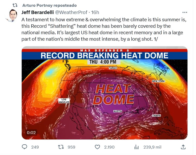 MÁS PLAGAS BÍBLICAS (EN INGLÉS) VIENE LA CUENTA DEL EXTRACTIVISMO PETROLERO ROCKEFELLER Un testimonio de lo extremo y abrumador que es el clima este verano, este domo de calor Récord «demoledor» apenas ha sido cubierto por los medios nacionales. Es el domo de calor más grande de Estados Unidos en la historia reciente y en gran parte del centro del país el más intenso, con diferencia.