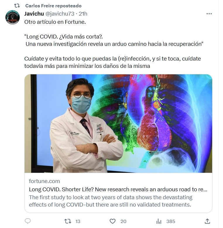 Otro artículo en Fortune. «Long COVID. ¿Vida más corta?. Una nueva investigación revela un arduo camino hacia la recuperación» Cuídate y evita todo lo que puedas la (re)infección, y si te toca, cuídate todavía más para minimizar los daños de la misma