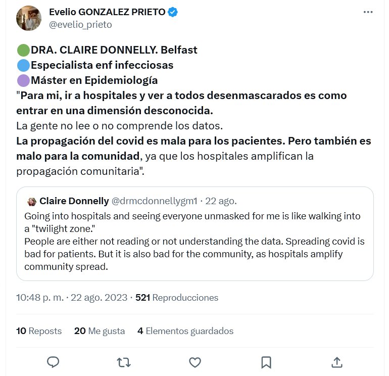 🟢DRA. CLAIRE DONNELLY. Belfast 🔵Especialista enf infecciosas 🟣Máster en Epidemiología «Para mi, ir a hospitales y ver a todos desenmascarados es como entrar en una dimensión desconocida. La gente no lee o no comprende los datos. La propagación del covid es mala para los pacientes. Pero también es malo para la comunidad, ya que los hospitales amplifican la propagación comunitaria».