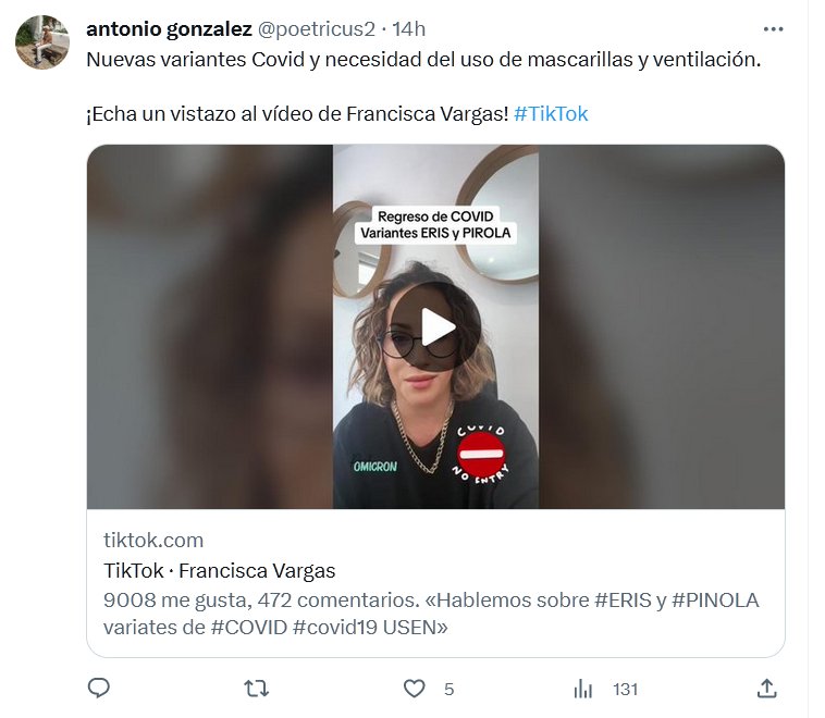 Nuevas variantes Covid y necesidad del uso de mascarillas y ventilación. ¡Echa un vistazo al vídeo de Francisca Vargas! #TikTok Posted on agosto 23, 2023 por coronado @mafravamaga Hablemos sobre #ERIS y #PINOLA variates de #COVID #covid19 USEN #cubrebocas #regresoaclases2023 ♬ sonido original - Francisca Vargas