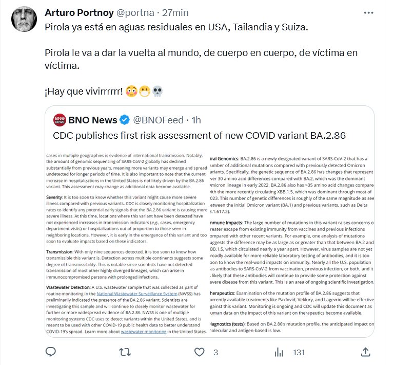 Pirola ya está en aguas residuales en USA, Tailandia y Suiza. Pirola le va a dar la vuelta al mundo, de cuerpo en cuerpo, de víctima en víctima. ¡Hay que vivirrrrrr! 😳😷💀 Posted on agosto 23, 2023 por coronado
