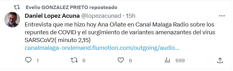 Daniel Lopez Acuna @lopezacunad · Entrevista que me hizo hoy Ana Oñate en Canal Malaga Radio sobre los repuntes de COVID y el surgimiento de variantes amenazantes del virus SARSCoV2 Posted on agosto 24, 2023 por coronado http://canalmalaga-ondemand.flumotion.com/outgoing/audio/mp3/high/20230823100600_LMXJV_1006_1100_ALDIA1_A_1X1_1_T22-23_P211_MAGACIN_MALAGA_AL_DIA_1_DE_VERANO-CANAL_MALAGA_RADIO.mp3